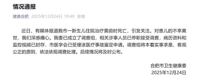 12月24日,合肥市衛(wèi)健委發(fā)布情況通報(bào):近日,有媒體報(bào)道我市一新生兒住院治療黃疸時(shí)死亡,引發(fā)關(guān)注。對(duì)患兒的不幸離世,我們深感痛心。我委已成立了調(diào)查組,相關(guān)涉事人員已停職接受調(diào)查,病歷資料和監(jiān)控視頻已封存,市醫(yī)學(xué)會(huì)已受理該醫(yī)療事故鑒定申請(qǐng)。...